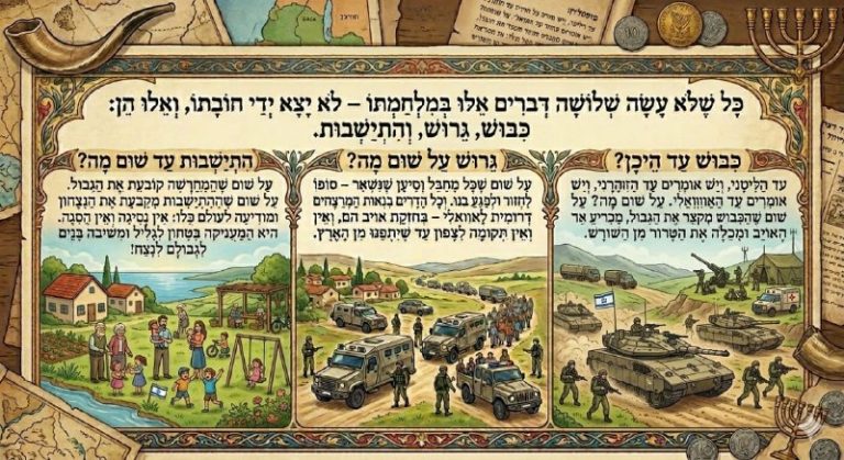 31/03/2026 כָּל שֶׁלֹּא עָשָׂה שְׁלוֹשָׁה דְּבָרִים אֵלּוּ בְּמִלְחַמְתּוֹ – לֹא יָצָא יְדֵי חוֹבָתוֹ, וְאֵלּוּ הֵן:כִּבּוּשׁ, גֵּרוּשׁ, וְהִתְיַשְּׁבוּת. כִּבּוּשׁ עַד הֵיכָן?עַד