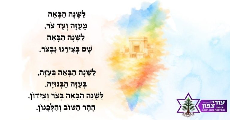 03/04/2026 לַשָּׁנָה הַבָּאָהמֵעַזָּה וְעַד צֹר,לַשָּׁנָה הַבָּאָהשָׁם בְּצִירֵנוּ נִבְצֹר. לַשָּׁנָה הַבָּאָה בְּעַזָּה,בְּעַזָּה הַבְּנוּיָה.לַשָּׁנָה הַבָּאָה בְּצֹר וְצִידוֹן,הָהָר הַטּוֹב וְהַלְּבָנוֹן. שבת שלום וחג