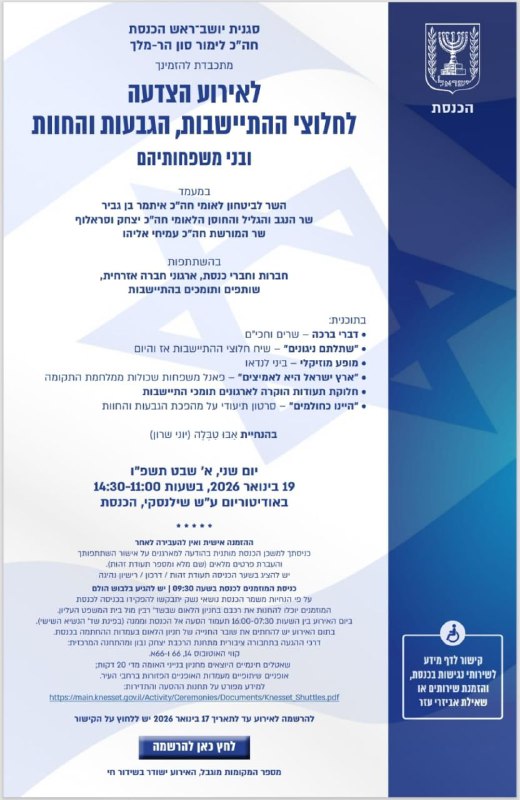 אירוע הצדעה בכנסת לחלוצי ההתיישבות, של ח"כ לימור סון הר מלך, ביום שני הקרוב!