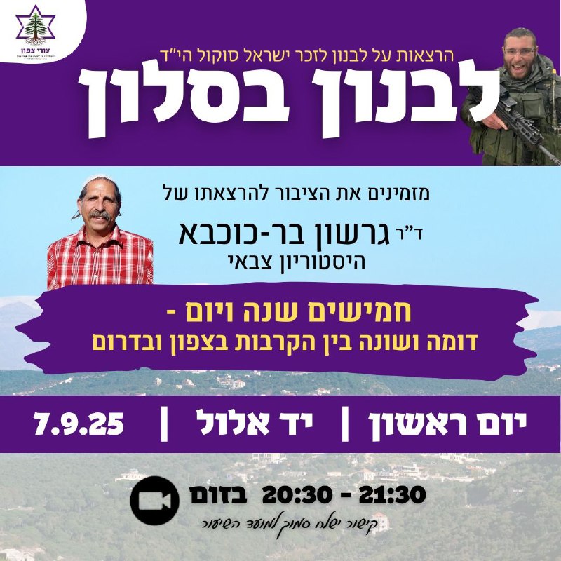 04/09/2025 תזכורת – יום ראשון הקרוב 🗓️ י"ד אלול התשפ"ה 7.9.25 בשעה 20:30 בזום. הרצאתו של ההיסטוריון הצבאי ד"ר גרשון בר כוכבא במסגרת לבנון בסלון. "חמישים שנה ויום – דומה ושונה בין הקרבות בצפון ובדרום" עורי צפון – התנועה להתיישבות בדרום הלבנון ע"ש ישראל סוקול הי"ד באתר https://uritsafon.com בווטסאפ https://chat.whatsapp.com/BZmQvykXtE9HvKrk6531c2 ובטלגרם https://t.me/+TkiP8S2MvGg4NTI0