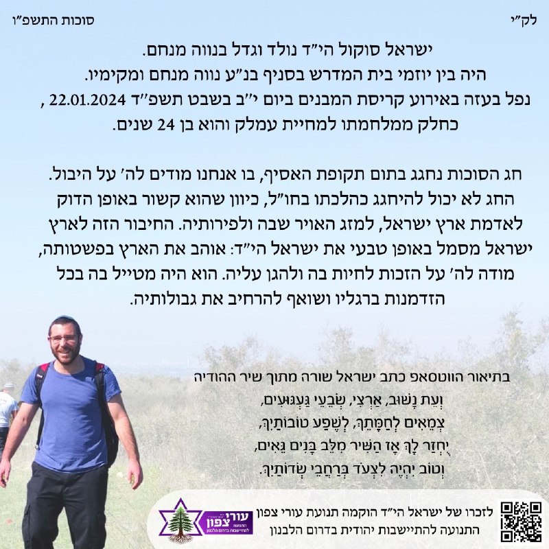 חג הסוכות הוא חגה של ארץ ישראל. ישראל סוקול הי"ד, שלזכרו הוקמה התנועה, אהב את הארץ בכל נימי נפשו ושאף להרחיב את גבולותיה.